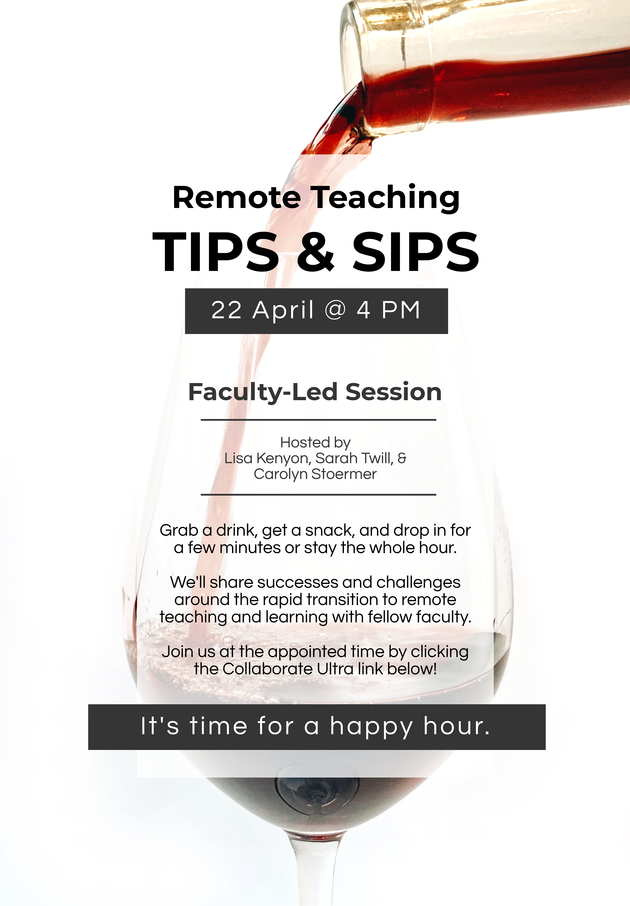 Join Lisa Kenyon, Sarah Twill, and Carolyn Stoermer for this faculty-led, virtual happy hour session. Grab a drink, get a snack, and drop in for a few minutes or stay the whole hour. We'll share successes and challenges around the rapid transition to remote teaching and learning with fellow faculty.