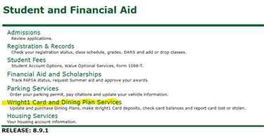 Select Wright1 Card Services for Students under Wright1 Card and Parking.
