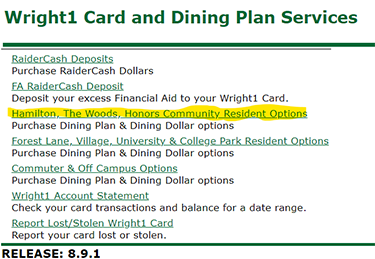 Select Hamilton, The Woods, Honors Community Resident Options and then follow the instructions to change dining dollar plan.
