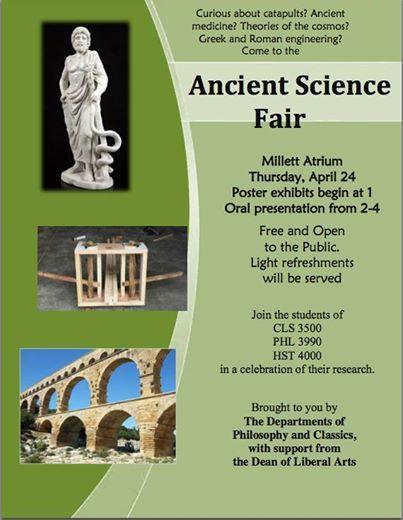 Ever want to see a catapult in action? Curious about ancient medicine? Join us for the Ancient Science Fair. This student conference is presented in conjunction with the Ancient Science Class. There will be oral presentations, a poster session, and demonstrations of machines. All are welcome. Poster session begins at 1; oral presentations from 2-4.