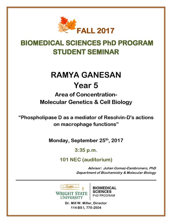 Ramya Ganesan (5th year student) will present "Phospholipase D as a mediator of Resolvin-D's actions on macrophage functions".