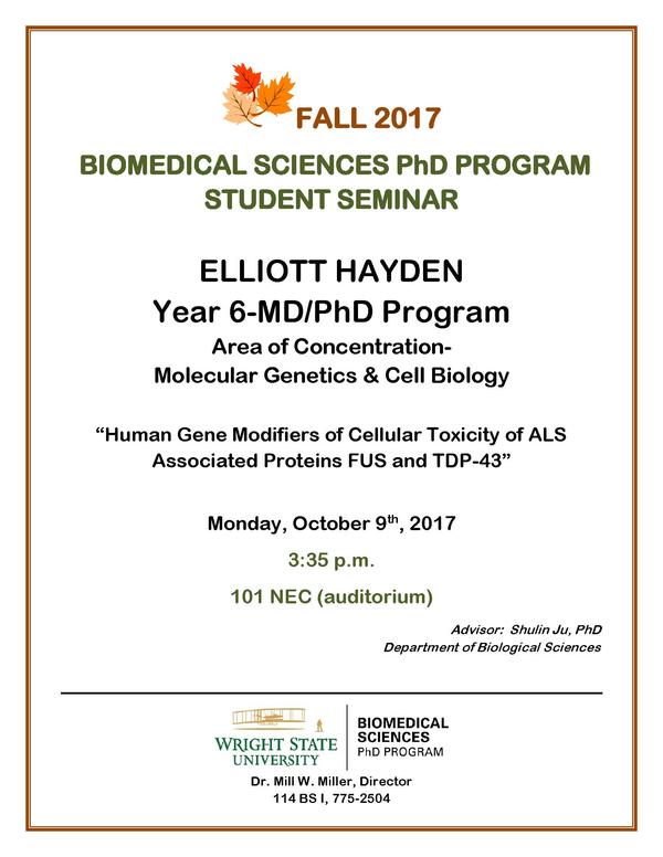 Biomedical Sciences PhD Program Student Seminar "Human Gene Modifiers of Cellular Toxicity of ALS Associated Proteins FUS and TDP-43"