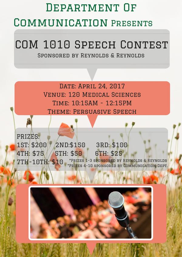 Conducted every fall and spring, the COM 1010 Speech Contest is an opportunity for students to compete for prizes by presenting a speech based on a topic that applies to the theme of persuasive speech. Join us to watch your fellow classmates and celebrate the evolution of the Department of Communication's public speaking program. The Spring 2017 Speech Contest is being held Aprill 24, 2017 from 10:15AM to 12:15PM in 120 Medical Sciences Building.
