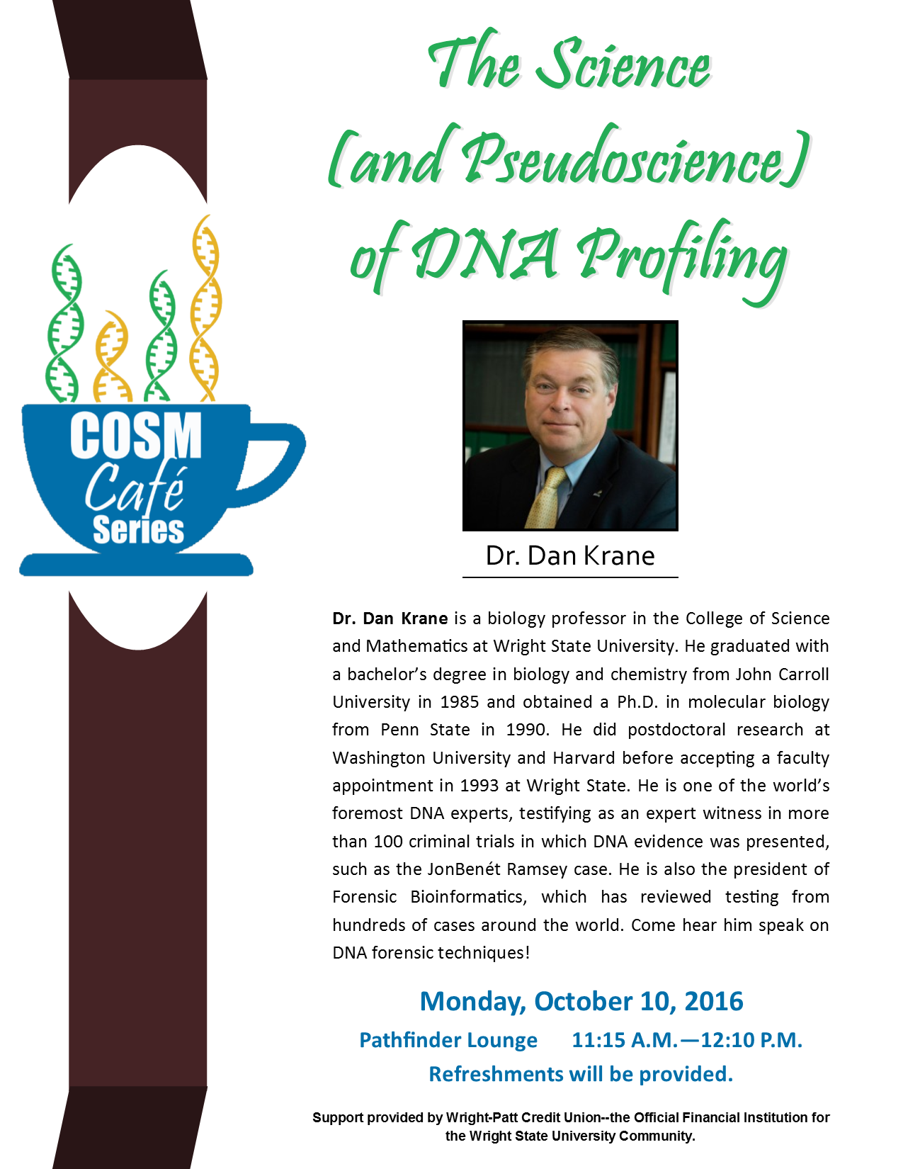 Dr. Dan Krane is a biology professor in the College of Science and Mathematics at Wright State University. He graduated with a Bachelor's degree in Biology and Chemistry from John Carroll University in 1985 and obtained a Ph.D. in Molecular Biology from Penn State in 1990. He did postdoctoral research at Washington University and Harvard before accepting a faculty appointment in 1993 at Wright State. He is one of the world's foremost DNA experts, testifying as an expert witness in more than 100 criminal trials in which DNA evidence was presented, such as the JonBenet Ramsey case. He is also the president of Forensic Bioinformatics, which as reviewed testing from hundreds of cases around the world. Come hear him speak on DNA forensic techniques!