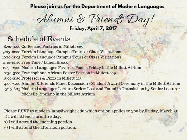 The Department of Modern Languages invites alumni and current students to enjoy one or several of the events held throughout the day. Contact the department, (937) 775-2641 or modern_languages@wright.edu.