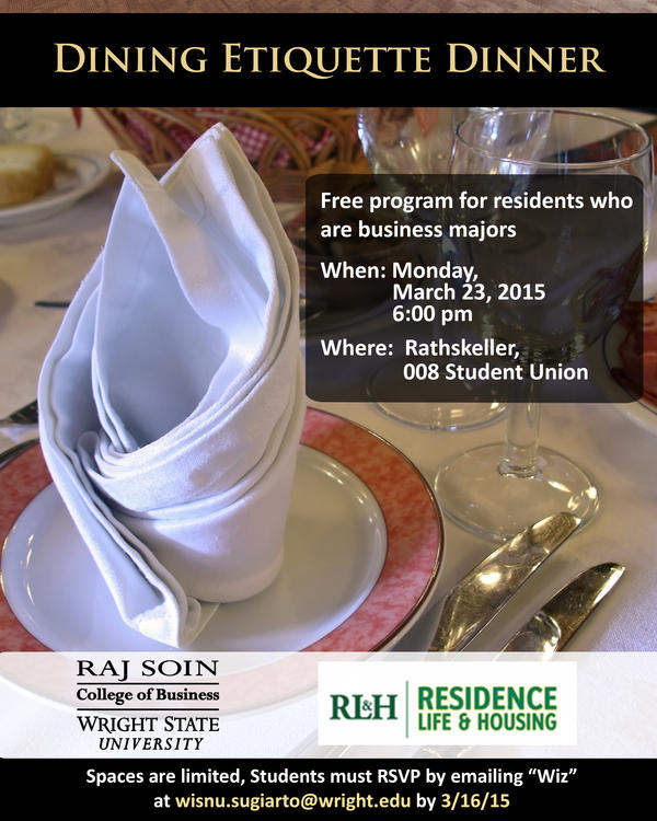 Are you a business student that currently lives on campus? Do you like free dinner? Residence Life and our college have teamed up for a Dining Etiquette Dinner! Dean Li will be speaking! Only 30 spots available! RSVP today!