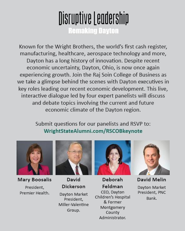 The Raj Soin College of Business (RSCoB) Institute for Innovation and Entrepreneurship is pleased to present the annual Business Keynote for 2016-2017. This year's topic is Disruptive Leadership: Remaking Dayton. This live, interactive dialog led by four expert panelists and two moderators will discuss and debate topics involving the current and future economic climate of the Dayton region. Please submit questions when registering for the panelists to respond to during the first portion of the event. This is a free event and is open to the campus community and the public.