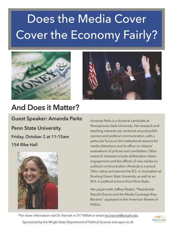 Amanda Parks (B.S. Bowling Green, M.A. Penn State) is a doctoral candidate at Pennsylvania State University. Her research and teaching interests are centered around public opinion and political communication, with a particular focus on the institutional reasons for media distortions and its effect on citizens’ evaluations of policies and candidates. Other research interests include deliberative citizen engagement and the effects of new media on political communication. Amanda is a proud Ohio native and earned her B.S. in Journalism at Bowling Green State University, as well as an M.A. in political science from Penn State.