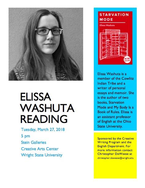 The Wright State University Creative Writing Program & English Dept. present a reading and Q&A with nonfiction writer Elissa Washuta.