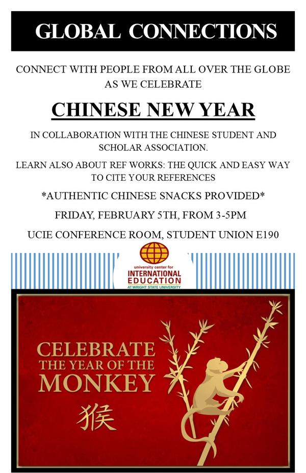 Connect with people from all over the globe as we celebrate Chinese New Year in collaboration with the Chinese Student and Scholar Association. Also learn about Ref Works, the quick and easy way to cite your references, taught by Library Services. Authentic Chinese snacks will be provided.