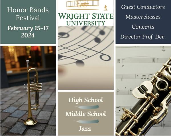 The Wright State University Honor Band Festival is an event hosted at Wright State University that includes two high school concert bands, a middle school concert band, a high school jazz band, and a day of professional development for band directors. Participating students will work with two conductors, play in side-by-side rehearsals with Wright State music faculty and music majors, attend masterclasses given by Wright State faculty, and perform a concert on the Saturday of the festival.