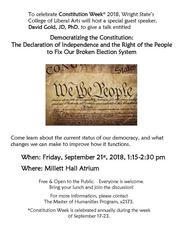 To celebrate Constitution Week* 2018, Wright State's College of Liberal Arts will host a special guest speaker, David Gold, J.D., Ph.D. Come learn about the current status of our democracy, and what changes we can make to improve how it functions.