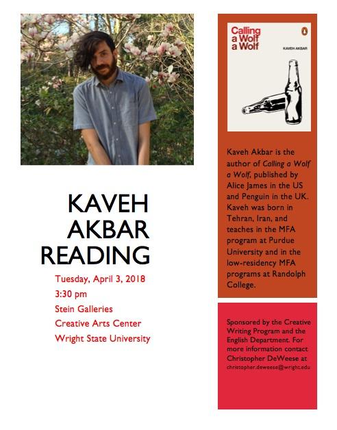 The Wright State University Creative Writing Program & English Dept. present a reading and Q&A with poet Kaveh Akbar.