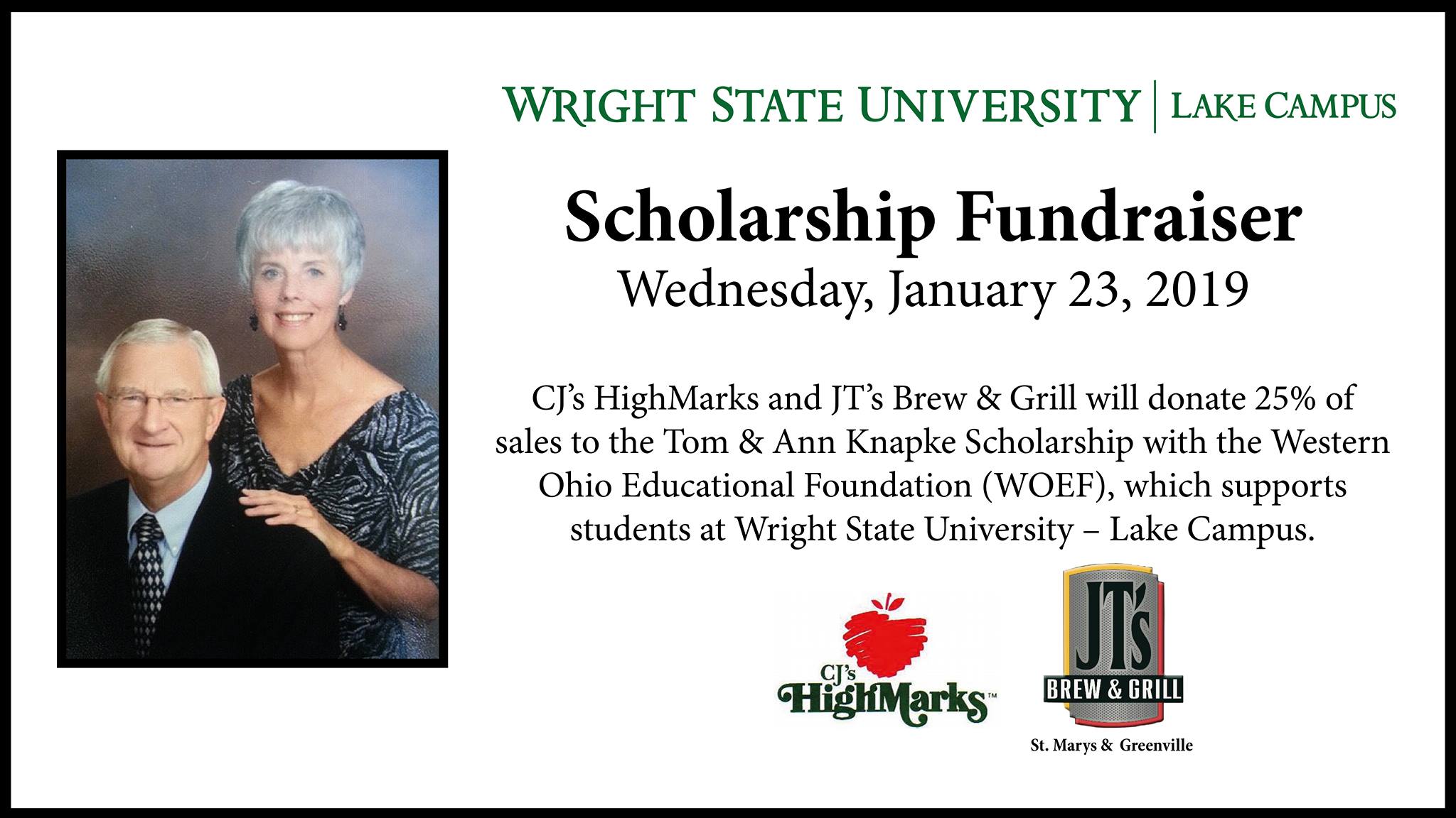 CJ’s HighMarks (Celina) and JT’s Brew & Grill (St. Marys and Greenville) will donate 25% of sales to the Tom & Ann Knapke Scholarship with the Western Ohio Educational Foundation (WOEF), which supports students at Wright State University – Lake Campus.