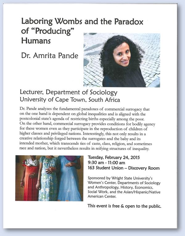 Dr. Amrita Pande, Lecturer in the Department of Sociology, will present Laboring Wombs and the Paradox of "Producing" Humans.
