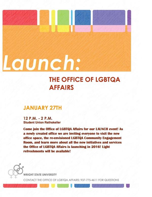 Come join the Office of LGBTQA Affairs for our LAUNCH event! As a newly created office we are inviting everyone to visit the new office space, the re-envisioned LGBTQA Community Engagement Room, and learn more about all the new initiatives and services the Office of LGBTQA Affairs is launching in 2016! Light refreshments will be available!