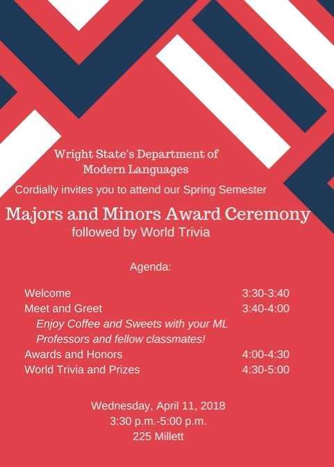 Join us for the Modern Languages Major and Minor Ceremony Award. See the brochure for details.