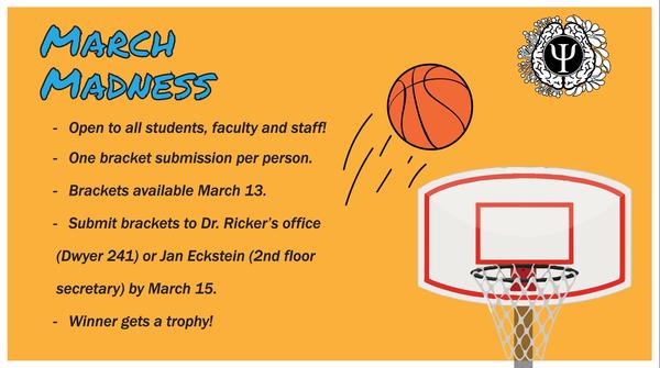 The Lake Campus Psychology Club is hosting our first annual March Madness Bracket Challenge. Starting March 13, brackets will be available at various locations around campus to fill out and turn in by the end of the day on March 15. Submit your brackets to Dr. Ricker's office or to Jan Eckstein on the 2nd floor of Dwyer hall.