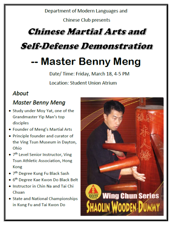 The Chinese Club will invite Dayton’s famous Chinese martial arts master, Benny Meng, to teach our members self-defense.