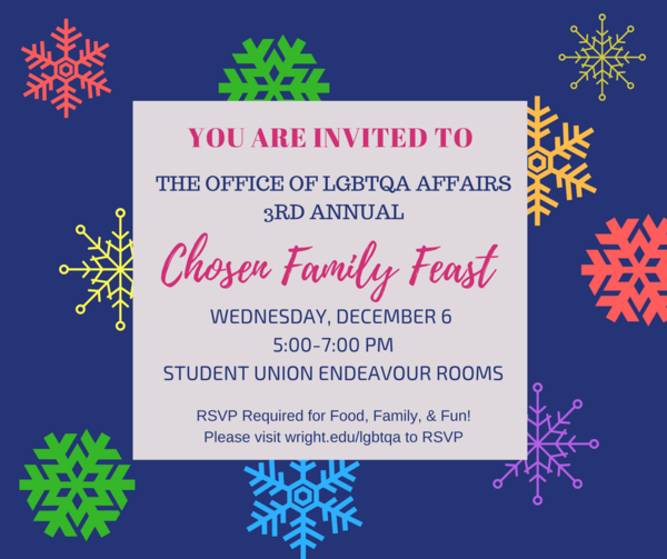 The 3rd Annual Office of LGBTQA Affairs Chosen Family Feast is an event intentionally held between Wright State's Thanksgiving break and winter break. This event is a time for the LGBTQA+ Wright State community to celebrate this time of year with their chosen family. There is always great food, a chosen family photo booth, and a chance to expand and create deeper connections with your chosen family!