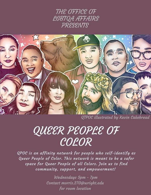 QPOC is an affinity network for people who self-identify as Queer People of Color. This space is meant to be a safer space for Queer People of all Colors. Join us to find community, support, and empowerment! For more information and meeting location for Spring 2018 please contact Shaquetta Morris at morris.270@wright.edu.