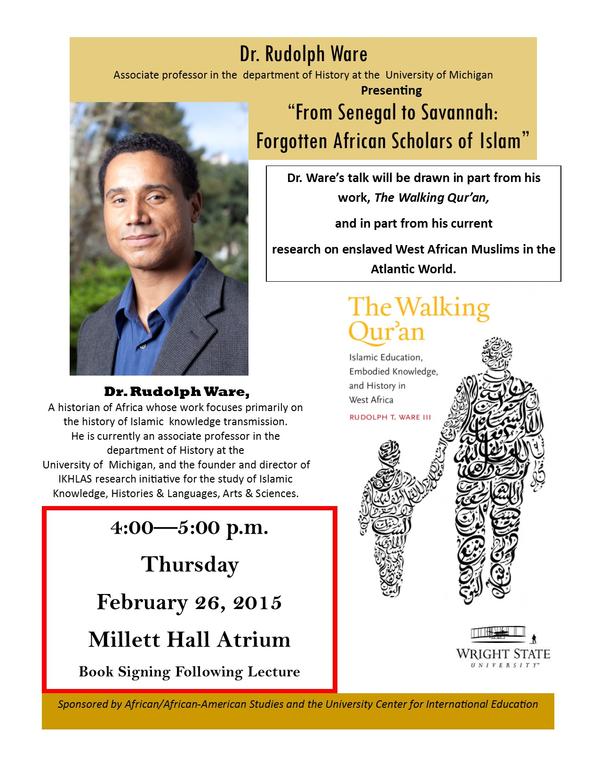 Dr. Rudolph Ware, Associate Professor of History at the University of Michigan, will present "From Senegal to Savannah: Forgotten African Scholars of Islam", highlighting topics from his work "The Walking Qur'an" and his research on enslaved West African Muslims in the Atlantic World. Please see the attachment for more details.