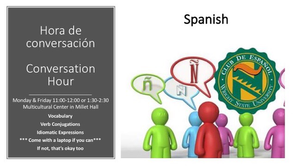 ¡La hora de conversación es una oportunidad charlar con nativos, aprender vocabulario, conjugaciones de verbos, expresiones útiles y más! Vengan a participar el lunes o el viernes de las 11:00 hasta las 12:00 o de la 1:30 hasta las 2:30 en el centro multicultural en Millett Hall. Cuando entras la zona de aprendizaje, no hay que preocuparse, todos estamos aprendiendo y mejorando nuestro hablar. Equivóquense y aprendan de sus errores :) ¿Nos vemos?