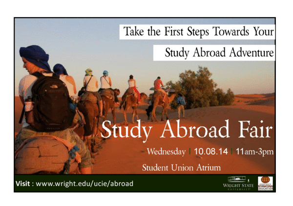 Stop on by Wright State’s Fall 2014 Study Abroad Fair and learn more information on all of the programs that Wright State University offers. While at the fair, you can meet professors that will be leading our summer Ambassador programs, meet with our third party providers that can help you study abroad both short term and long term, as well as meet our own study abroad and financial aid advisors.