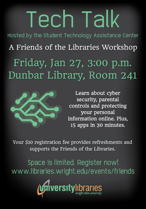 Join our Student Technology Assistance Center (STAC) staff and learn about cyber security, parental controls and how to protect your personal information online. Plus, get more from your mobile device - we'll review 15 of our favorite apps in 30 minutes. Your $10 registration supports the Friends of the Libraries. Register now, space is limited: www.libraries.wright.edu/events/friends