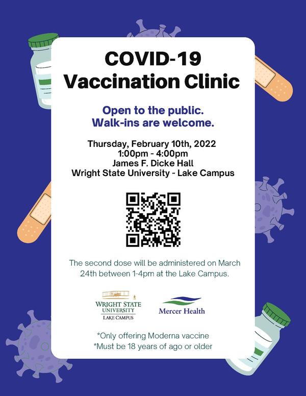 The Moderna vaccine will be administered by Mercer Health on Thursday, February 10th from 1-4pm at the Lake Campus in James F. Dicke Hall. You must be at least 18 years of age.