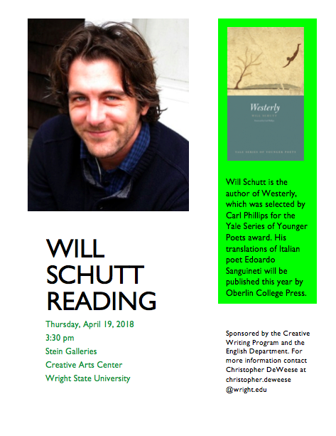 The Wright State University Creative Writing Program & English Dept. present a reading and Q&A with poet Will Schutt.