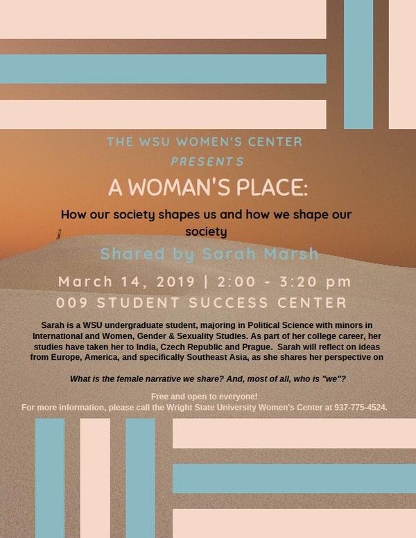 Sarah Marsh is a Wright State undergradutate student whose studies have taken her to India, Czech Republic and Prague. She will reflect on ideas from Europe, America, and specifically Southeast Asia, as she shares her perspective on the female narrative we share, and most of all who is "we"?