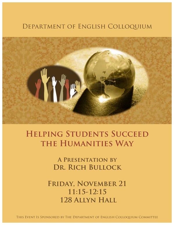 The WSU English department’s Colloquium Committee is pleased to announce its second event of the semester: “Helping Students Succeed the Humanities Way,” a presentation by Associate Chair and Director of Writing Programs, Dr. Richard Bullock.