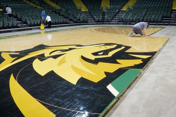 It takes a team of four, without breaks, two and half hours to completely construct the 15 rows of wood flooring for the men's and women's basketball court.