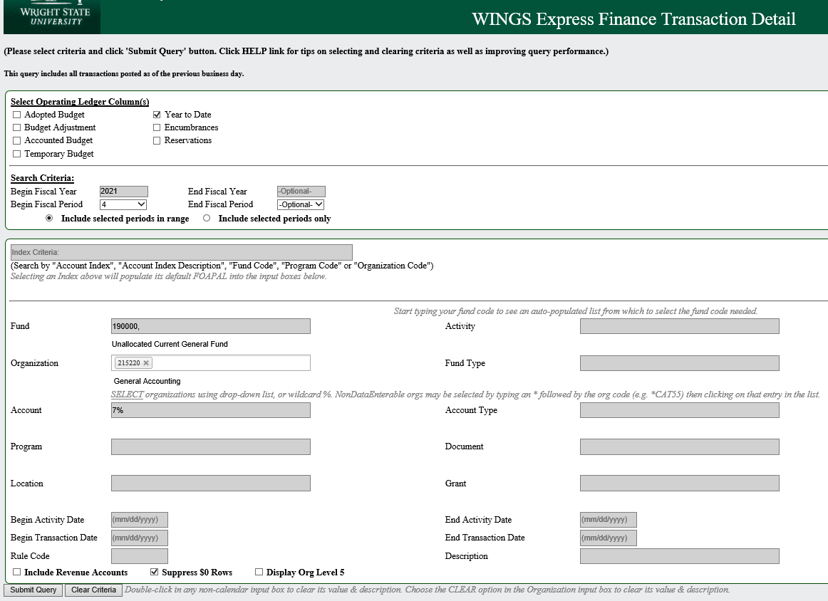 Transaction Detail query is very useful to get a list of all transactions for a given fund/org for monthly reconciliations or to search for specific transactions you are interested in. This report was created in-house at WSU.