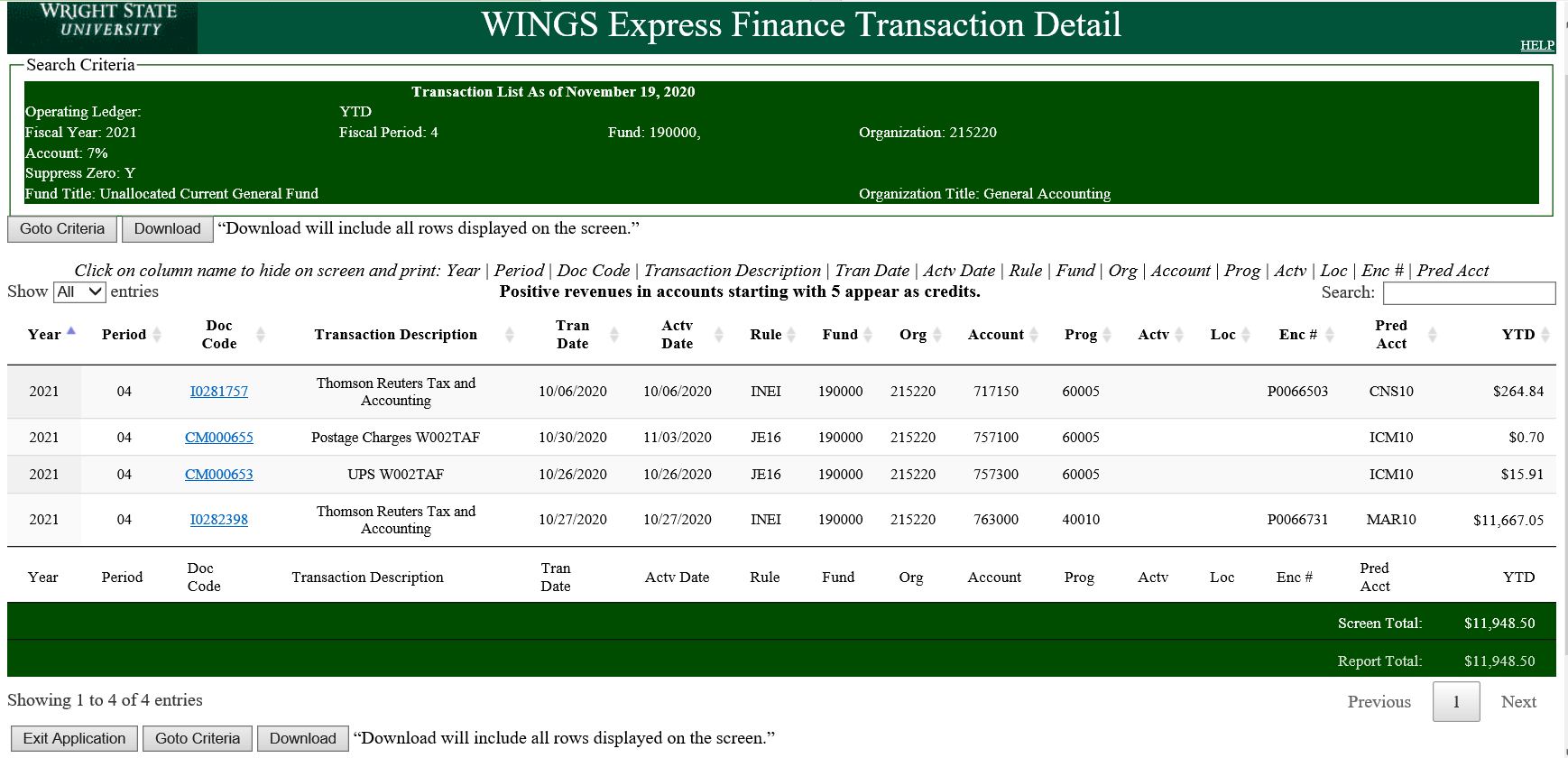 By selecting the Query Encumbrance link at the WINGS Express Finance home page, you can view all encumbrances as listed above.