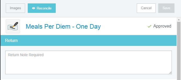 Approved amounts can only be reduced. If the traveler is owed more, the line item must be returned to the expense owner. To return individual expenses, select the appropriate expense and tap Return at the top of the expense detail pane. Then, provide an explanation in the Return Note dialogue box and tap Save.
