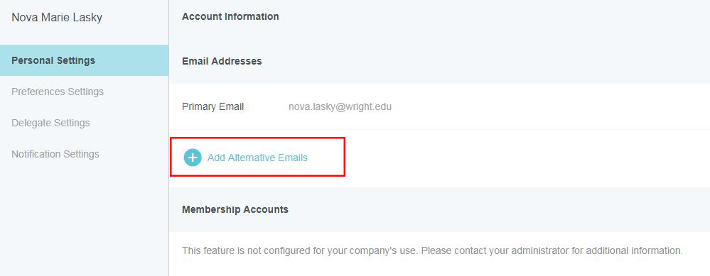 Select the Personal Settings menu. Account Information will display including the email addresses associated with the user's account. Tap the Add Alternative Emails button.