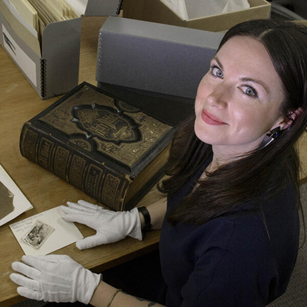 Graduate public history student Hadley Drodge is going through photos, drawings, Bibles and other materials to assemble the exhibit at the National Afro-American Museum.