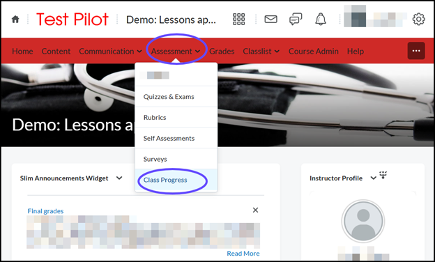 Class Progress is located under Assessment in the Navbar as well as Course Admin. When clicking on Class Progress, you can get a general overview of each student's course progress.