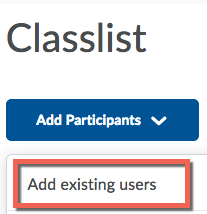 When the Classlist appears, click on Add Participants, then Add existing users (this refers to users that exist in the WSU system, not just the course).