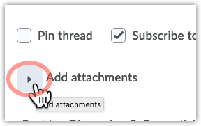 - To attach a file to a discussion post, either a new thread or a reply, click the little arrow to expand “Add attachments,” which is below the box where you write your message.