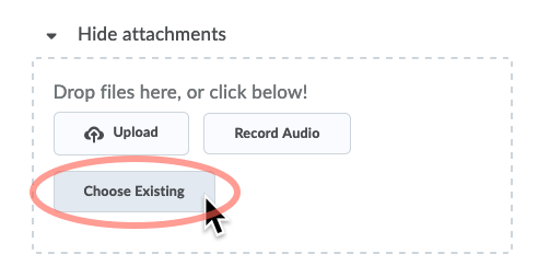 - Click the “Choose existing” button that you will now see. (Note: If you have a copy of the file on your computer, not in OneDrive, you can click the “Upload” button instead. That will let you attach the file from your computer.)