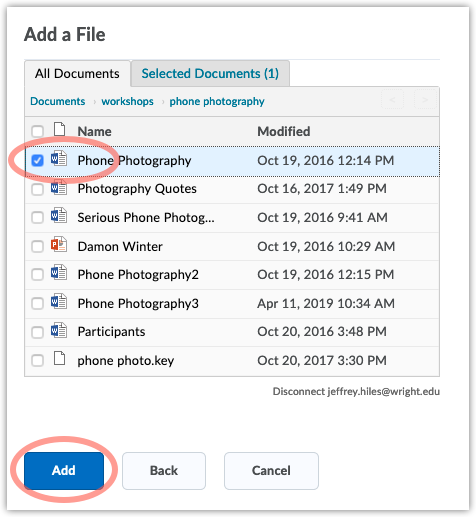 - Navigate your OneDrive files and check the box in front of the file you want, then click “Add.” You can check multiple files to add them all at once.