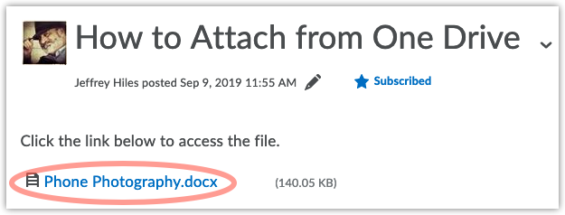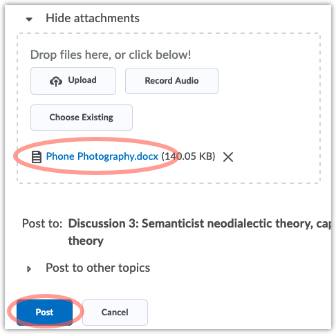 - Once you’ve clicked “Add,” you will be back in your post and should see the name of your file listed. Assuming your post has a heading and content, you can click post to make the post with it’s attached file available to your class.