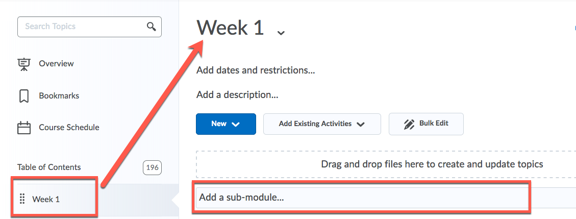 To add a sub-module, click on a module where you want to add it under Table of Contents so that the module opens. Then, type the name of the sub-module into the bar that says, “Add a sub-module“.