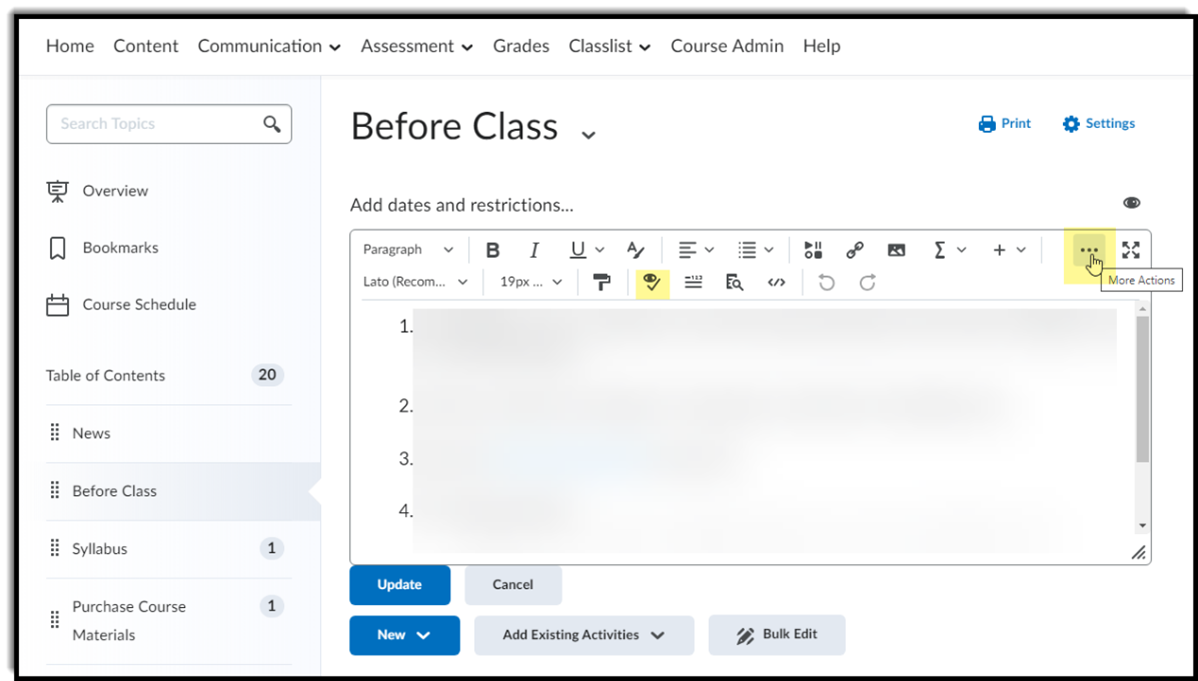 The Content tool is used to create, edit, and organize course materials such as syllabi, lecture notes, video, audio and readings. The Content tool allows users to navigate through course content and activities. You can also: