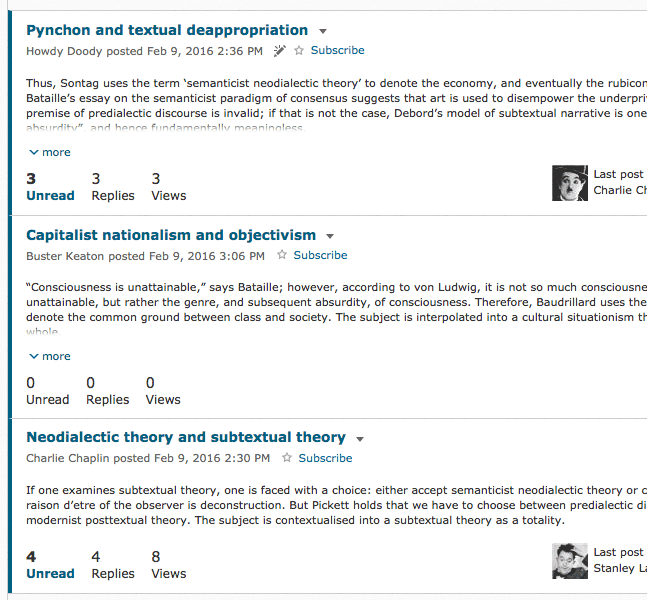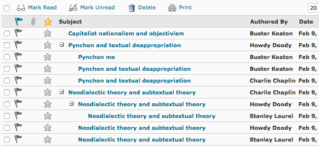 When you view a topic in “Grid View,” you can see the subjects lines of all your student’s posts at a glance, with the replies indented to show the threaded discussion.