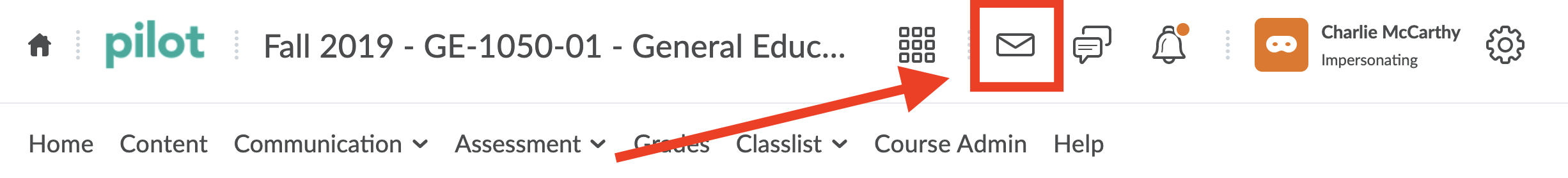 Go to your Pilot course and select the Envelope Icon from the top navigation menu. Then select the "Email" icon from the dropdown menu.