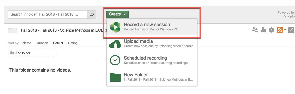 - Launch Panopto’s lecture/video recording software (Create > Panopto for Windows or Create > Panopto for Mac)